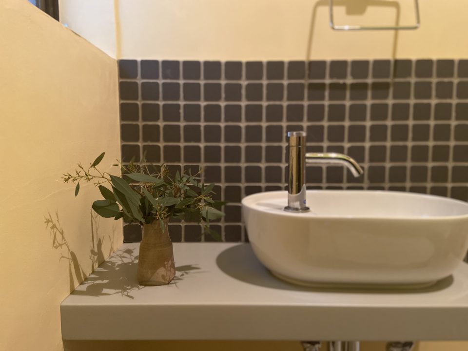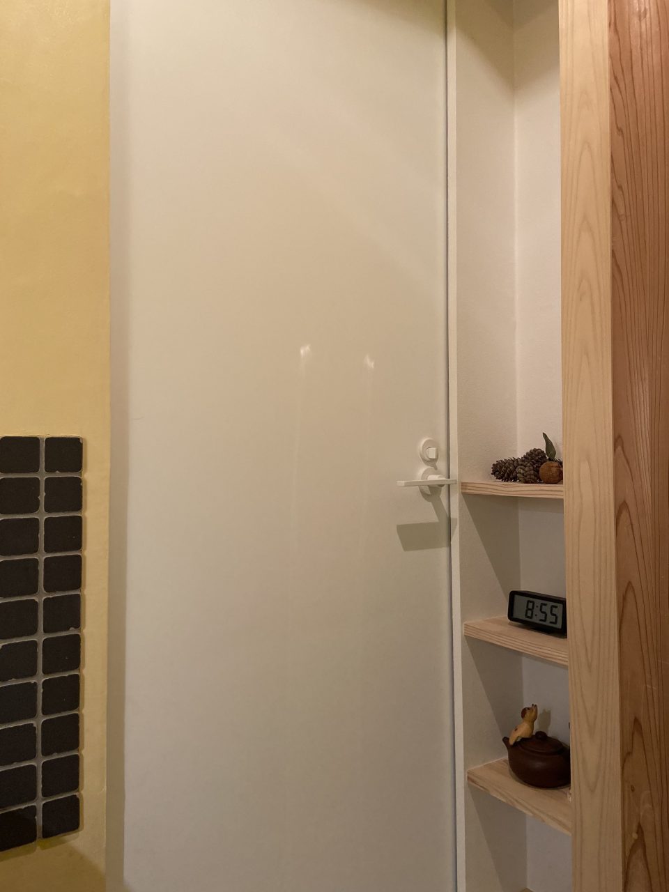 アートと暮らす家 WC 内装設計・インテリアコーディネート・アートディレクション 壁:Jパネル杉・ビニールクロス 枠なしの建具:KAMIYA 塗壁:スイス漆喰カルクウォール タイル:NEO-Nagae 目次に戻る←BACK